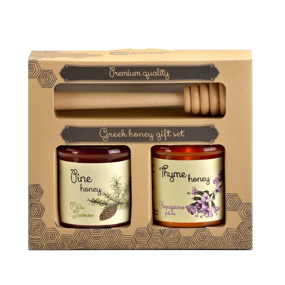Περιέχει 2 ποικιλίες άριστης ποιότητας Μέλια, Πεύκο και Θυμάρι.