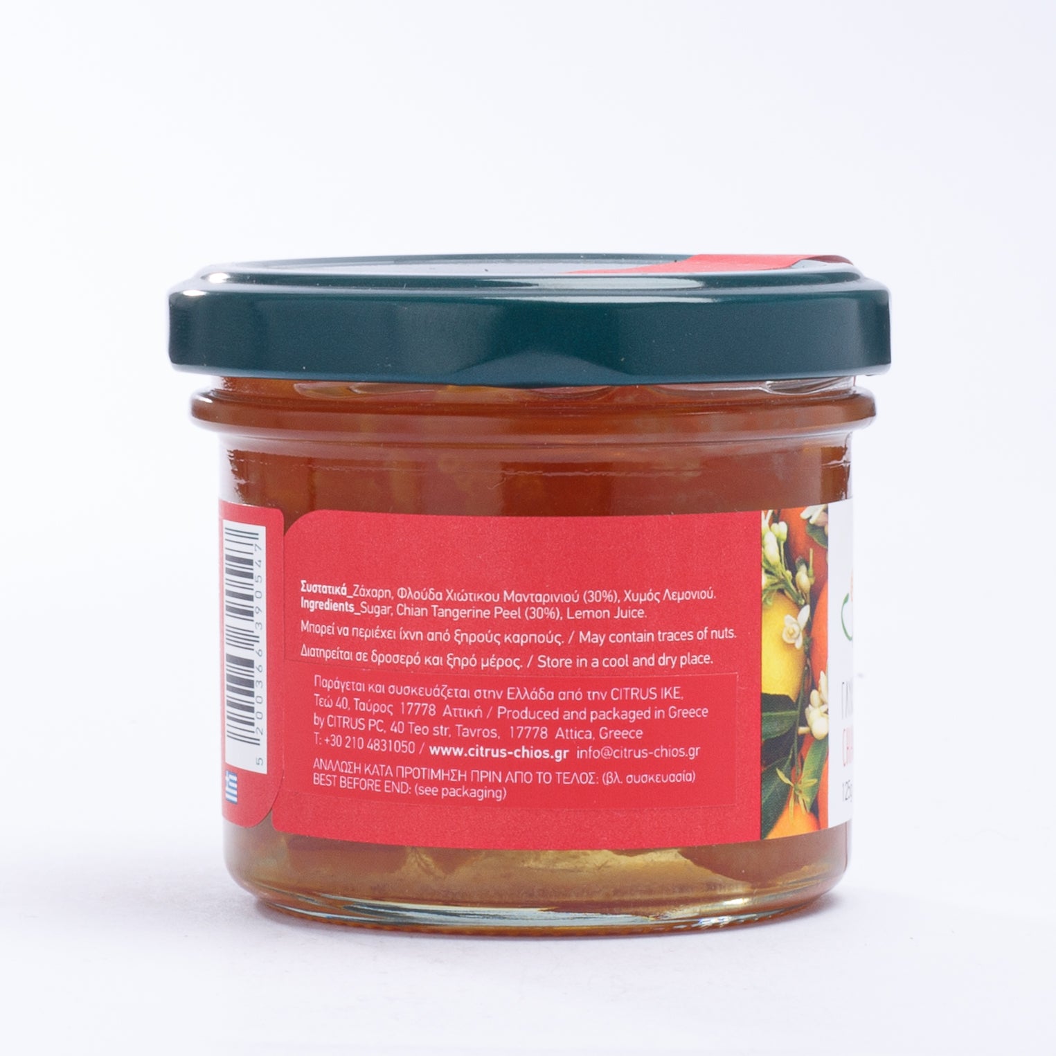 Citrus Tangerine Peel is made of Sugar, Chios Tangerine peel (30%) and Lemon juice. It is an excellent spoon sweet which retains the original shape, color, aroma and taste of the fruit.